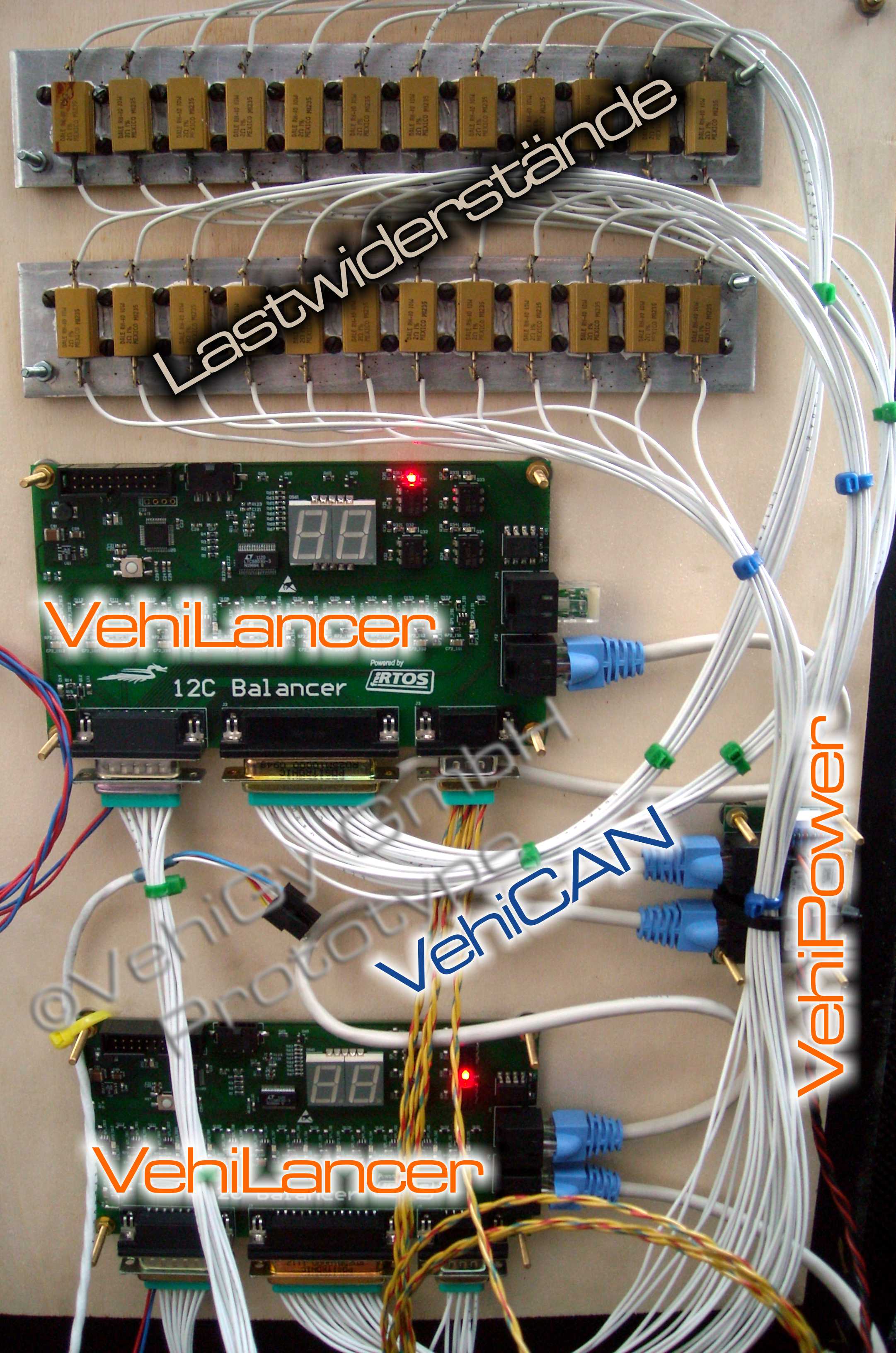 This picture gives again a more detailed overview of the 24 cell system. The monitored battery is composed of two blocks of 12 LiFePO4 cells in series each. The two RiseonBMS are connected through the CAN bus. The bus is also connected to the dash board - the VehiDash. Furthermore diagnostics tools - the VehiLyzer for instance - may be hot plugged to the system. The VehiLyzer is used to configure various parameters such as balancer voltage, end-of-charge current, low-voltage, etc..
