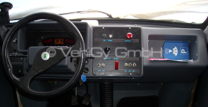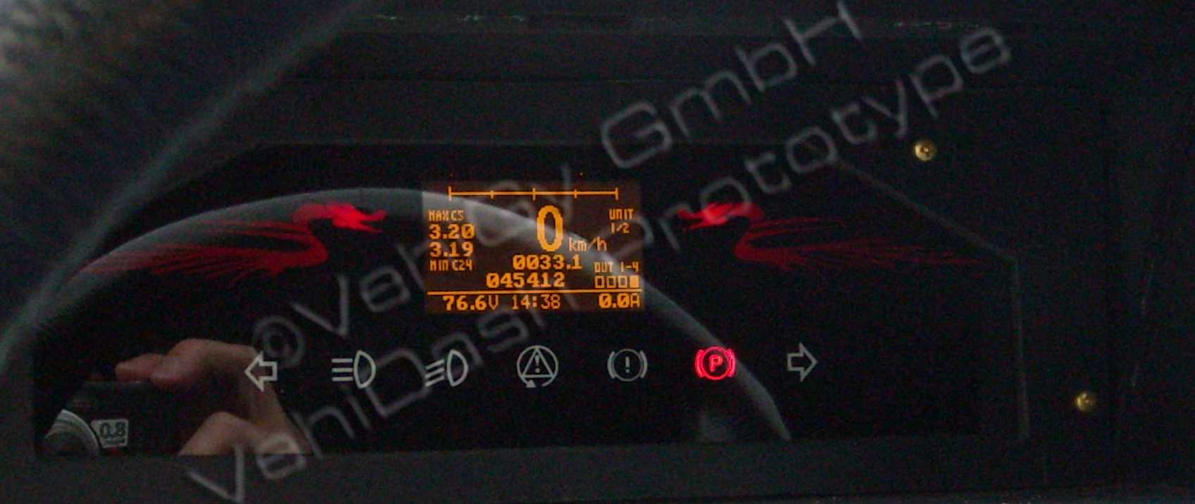 The main battery is divided into two blocks, each block containing 12 cell-modules in series, each module containing 6 single LiFePO4 cells (10Ah) in parallel. Thus the nominal voltage is 72V with a capacity of 60Ah. Each block is monitored by one RiseonBMS, which in turn are connected to each other by the CAN bus. As the CAN bus is by design completely isolated from the modules it is necessary to power it by means of an additional component, the VehiPower. The CAN bus is also routed to the cockpit where it connects to the VehiDash. It completely replaces the original dashboard and is certified for use on public roads.
